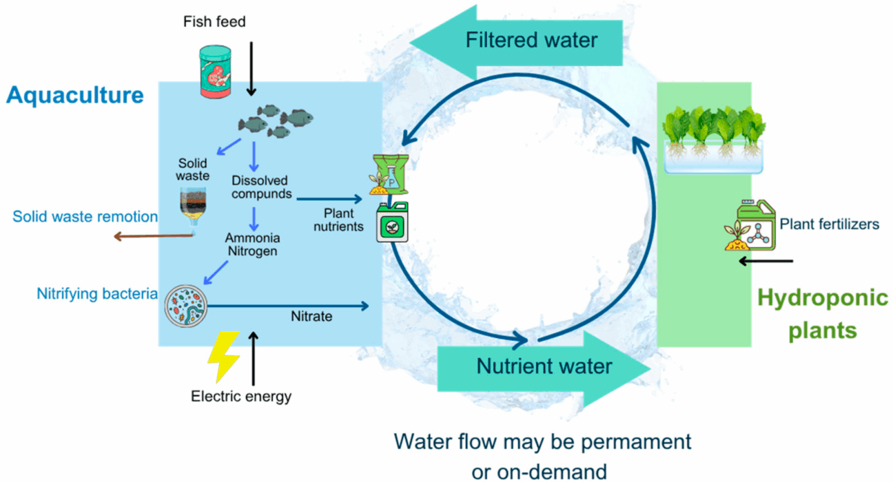 In recent years, aquaponics (Figure 1), a technology that couples tank-based animal aquaculture with hydroponics involving microbiological processes—using water from aquaculture for plant nutrition and irrigation [13]—has attracted the attention of researchers and entrepreneurs worldwide, as it is considered a sustainable system that can potentially improve food security in developed and developing countries in the face of drought, soil fertility loss, climate change, and urban growth [1,14,15].